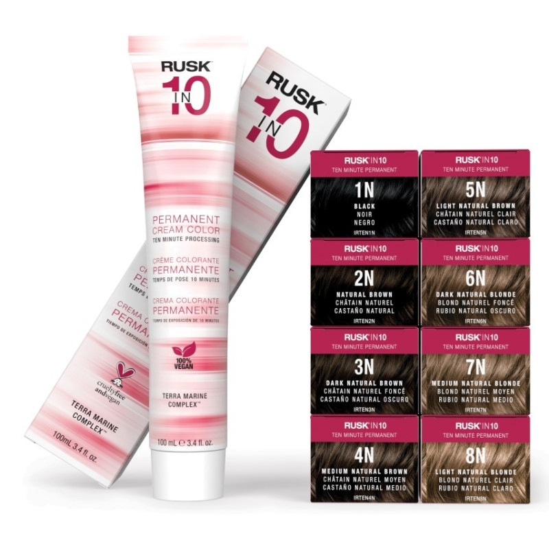 Reinvent your appointment book with Rusk in 10 permanent creme color!  This new hair color line offers 100% total grey coverage and rich, dimensional color with superior shine and condition that lasts - IN HALF THE TIME! With just ten minutes processing time, it is perfect for clients on-the-go, as a touch-up service, or a suggested add-on service. Especially today, Rusk in 10 is the perfect way to continue coloring clients who might be cautious about spending too much time in your chair, or clients who would otherwise resort to at-home color. It strengthens and protects the hair throughout the coloring process, has advanced micro pigments for natural looking tones and can be used on all hair types. Perfect performance and profitability make Rusk in 10 a perfect 10!